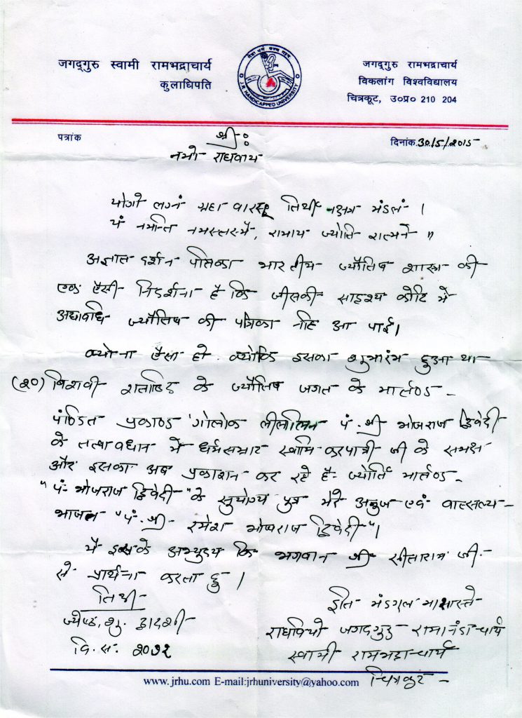 ख्याति प्राप्त ज्योतिर्विद व अज्ञातदर्शन के सम्पादक पं. रमेश भोजराज द्विवेदी की पुस्तक सरल ज्योतिष (शीघ्र बोध) का विमोचन पद्म विभूषण स्वामी रामभद्राचार्य जी महाराज ने […]
