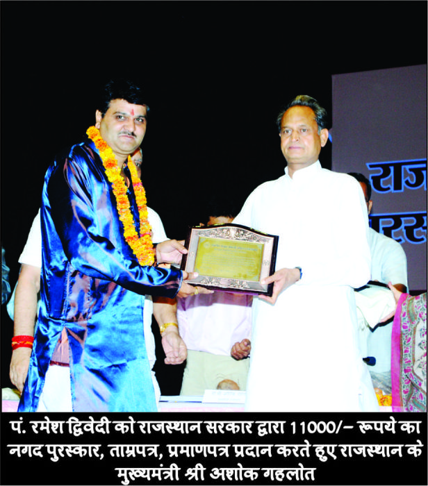 राजस्थान संस्कृत अकादमी द्वारा जयपुर में पं. रमेश द्विवेदी को पुरस्कृत किया गया। उन्हे ‘‘जगन्नाथ सम्राट ज्योतिष पुरस्कार’’ से सम्मानित किया गया। मुख्यमंत्री अशोक गहलोत ने […]