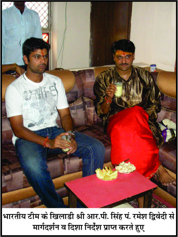 भारतीय क्रिकेट टीम के खिलाडी रूद्र प्रताप सिंह का अनुष्ठान सम्पन्न करवाने के बाद पं. रमेश भोजराज द्विवेदी . Indian Cricter R.P.Singh With Pt. Ramesh Dwivedi
